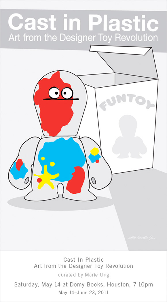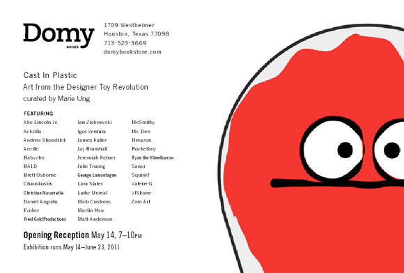 The designer toy revolution is about to make a big splash in Houston tomorrow night with the group show Cast In Plastic at Domy Books. This open platform independent custom toy show is curated by Marie Ung and will feature 30 of the finest customizers in the vinyl community. The opening is tomorrow night Saturday, May 14 from 7-10 pm and will be on display through June 23. You can also join the conversation and be friends on the Cast In Plastic Facebook page here.