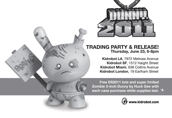 Dunny fever is spreading! Starting June 23, the spectacular new Dunny Series 2011 releases worldwide with trading parties going down at all Kidrobot Stores and Specialty retailers. To add to the excitement there will be 2 exclusive alternate colorways of the Zombie Dunny by Huck Gee that will be FREE with case purchases. There will be one blighted brown version on hand at shops in the Americas (North, Central and South) and the post-apocalyptic purple version will be available at International locations. Both versions are very limited and will also be available on kidrobot.com and kidrobot.eu. Find your nearest DS2011 trading party with our worldwide Google map.