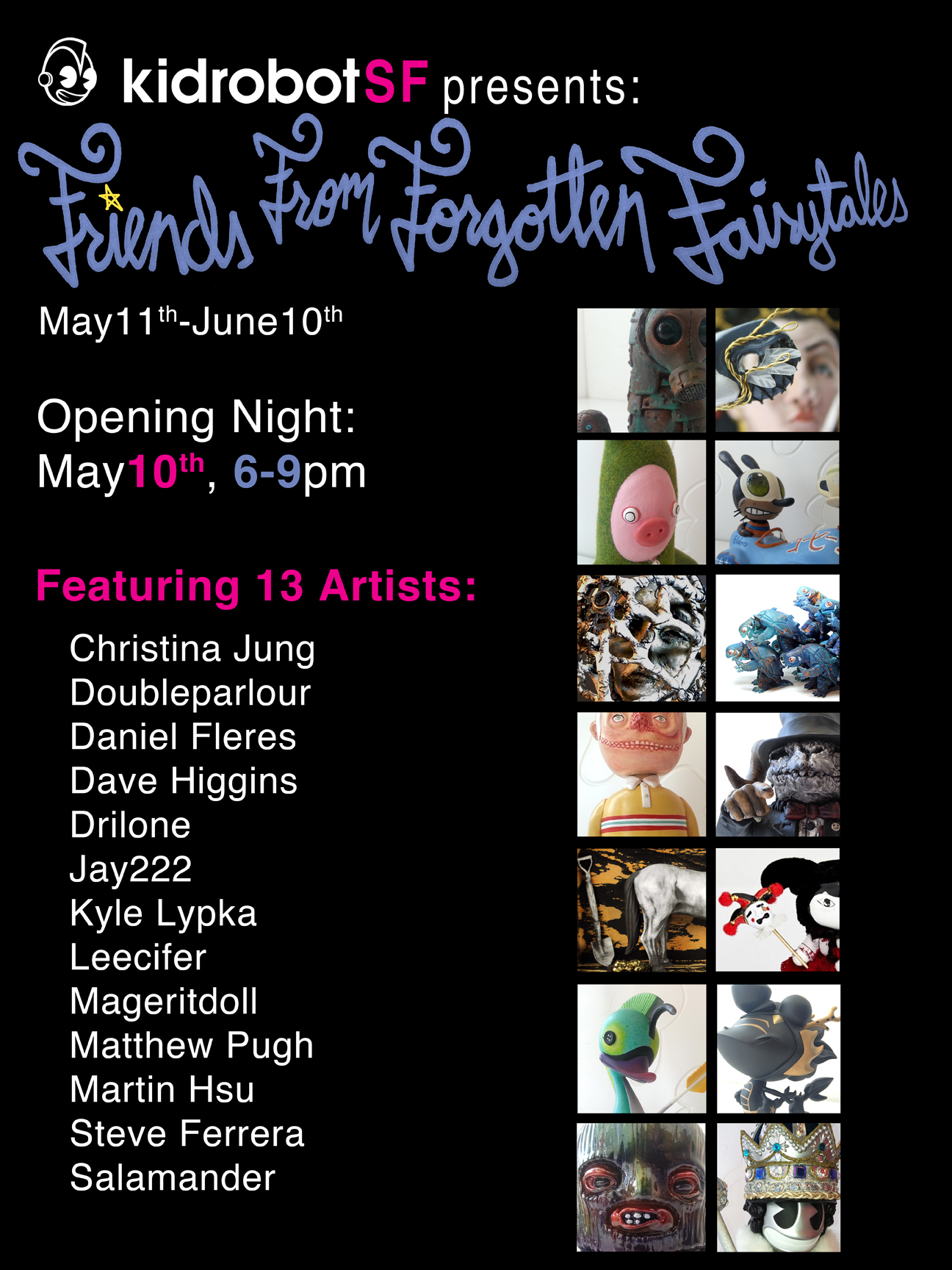 In a long forgotten future awakened at last from their eternal slumber, our forgotten friends are released from the crevices of our dreams. Are we ready to enter a world that does not belong to us? Kidrobot San Francisco invites you to meet the “Friends From Forgotten Fairytales”.
