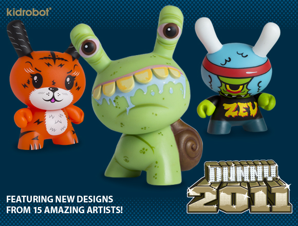 You better make room in your collection, because on beginning June 23, Dunny Series 2011 hits Kidrobot stores, kidrobot.com and specialty retailers worldwide. Featuring 18 designs from 15 inspired artists, 2011’s curation is killer – thanks to styles by KR vets Aya Kakeda, Chuckboy, Huck Gee, Kronk, MAD, Dirty Donny, Mister F®ame$ and Mishka, and debuting designs by deserved artists and customizers such as Squink!, 64 Colors, DrilOne, Elphonso Lam, Le Merde, Travis Lampe and Betso, 2010’s MUNNY MUNTH winner. Whatever your Dunny bent, Series 2011’s got you covered. $9.95/blind box (£7.90 UK; 9.20€ Europe).